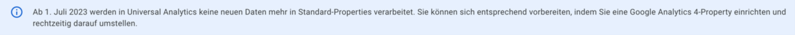 In diesem Hinweis wird empfohlen, rechtzeitig eine so genannte „GA4“-Property anzulegen.