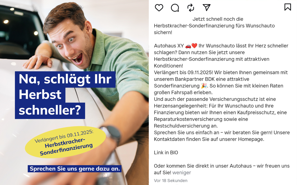 Unsere Sonderaktion „BDK Herbstkracher“ ist verlängert worden. Jetzt haben Sie bis zum 09. November 2025 die Möglichkeit, mit unseren Sonderzins-Konditionen Ihr Finanzierungsgeschäft anzukurbeln und sich für jede erfolgreiche Versicherungsvermittlung erhöhte Prämienpunkte zu sichern.